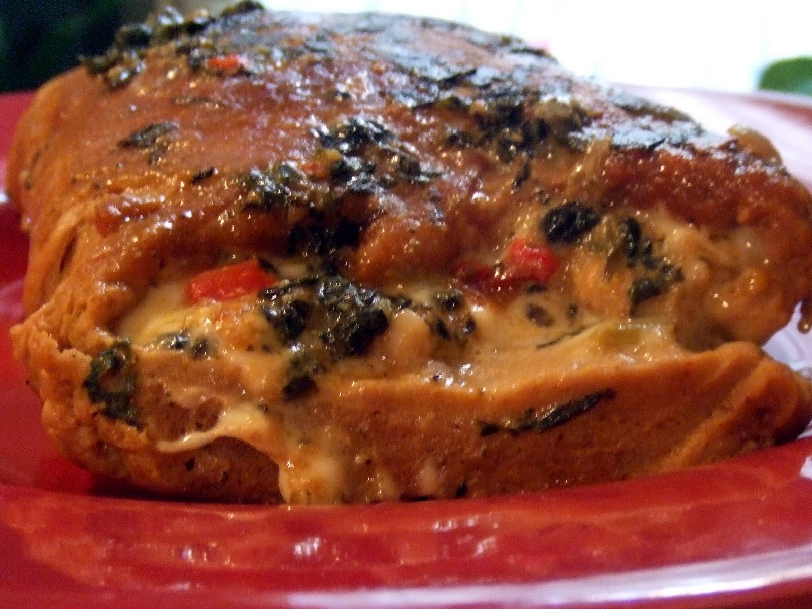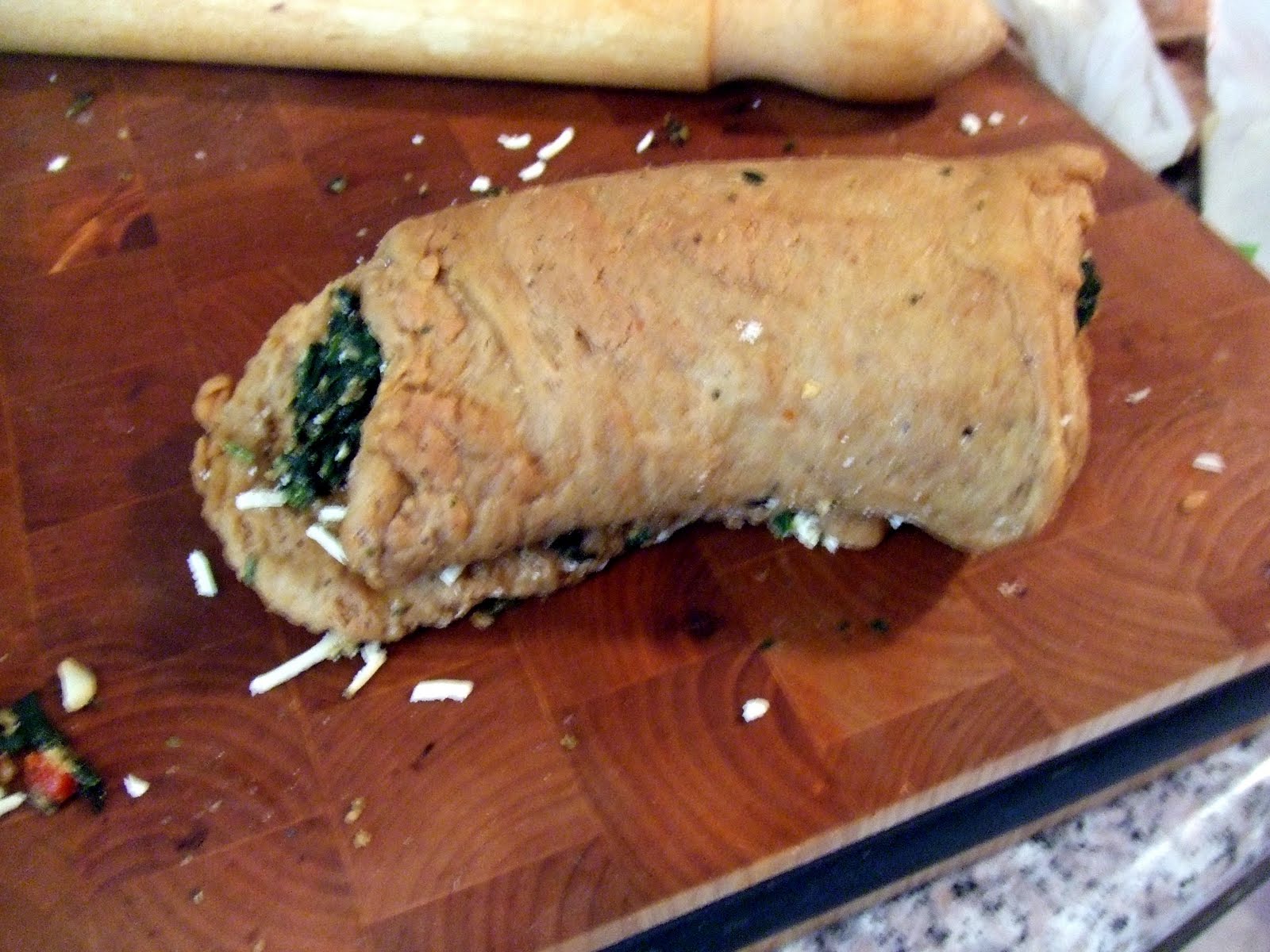Place a large skillet on the stove over medium high heat. Add 2 tablespoons extra-virgin olive oil to hot skillet. Add garlic to oil. Add onion and red pepper, cook 1 minute. Lower heat to medium. Add the spinach. Season with salt and pepper. Add bread crumbs and nutritional yeast to spinach. Turn off heat. Let stuffing cool.