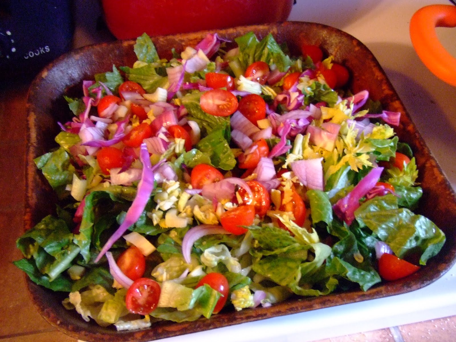 Chop lettuce, add celery, onions and tomatoes. I don’t make formal salad dressings. I just add Kosher or sea salt, pepper, garlic powder and dried (or fresh if I have) parsley to the salad. Then I pour about 3 Tbs. of balsamic vinegar and 2 Tbs. safflower oil on top and toss well. I know salad dressings are usually more oil than vinegar but again, I have to watch those calories.