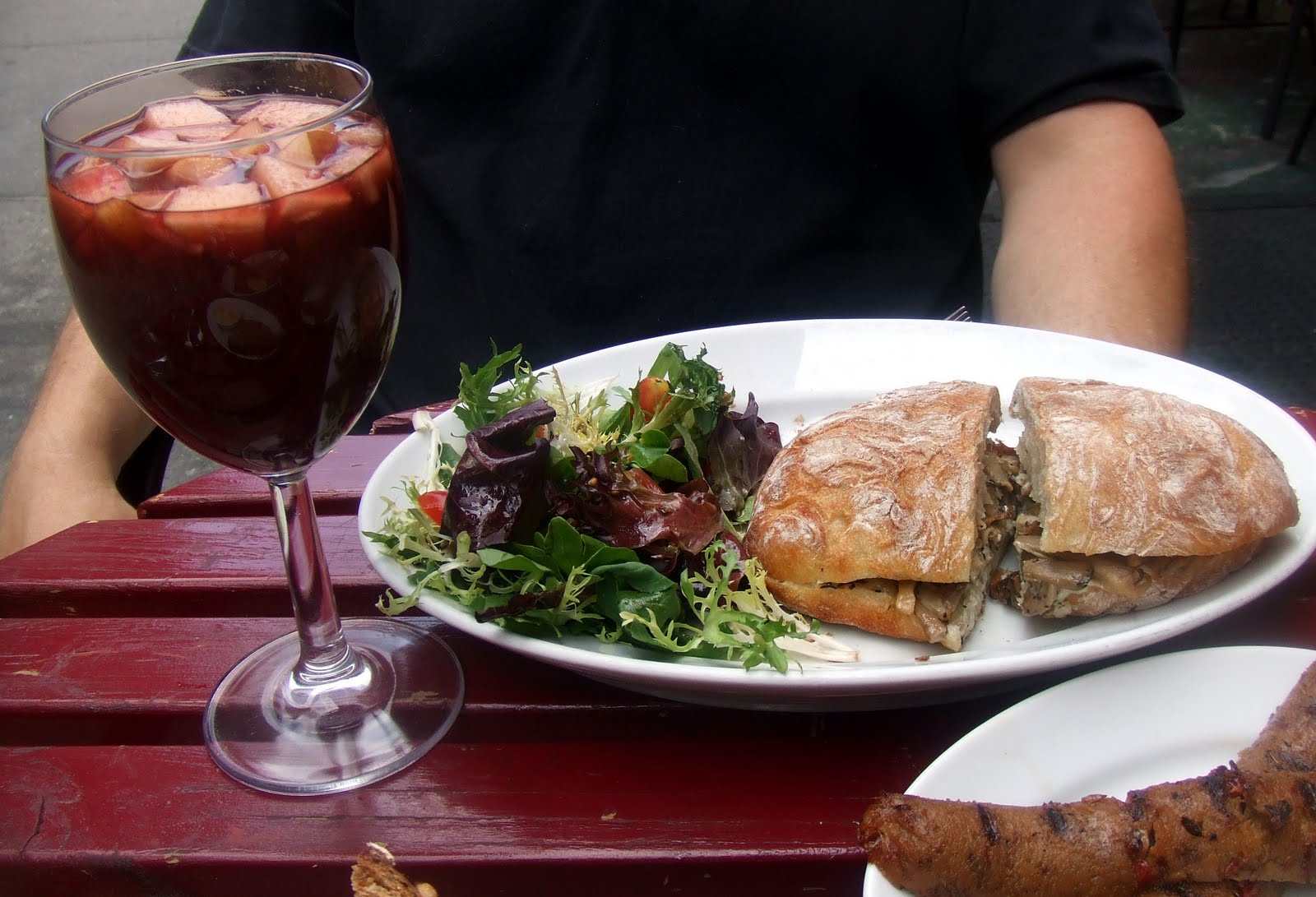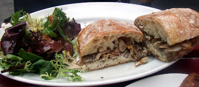 Tom ordered the truffled wild mushroom panini served on a warm ciabatta with onion fonduta (my new favorite culinary word) with a small salad on the side. The presentation was impressive and goodly sized. The ciabatta was toasted perfectly, just enough to give that crunch sound when he bit into it. I love my bread toasted and ciabatta is my favorite type of bread. I also love the name “ciabatta.” To me, the word sounds as crunchy as the bread tastes when it’s toasted properly. The taste of the truffled wild mushrooms was intense but further enhanced by the onion fonduta, a creamy paste of caramelized oniony goodness. As Tom said, “If the onion fonduta came in a jar, I’d eat it with a spoon.” The salad was fresh and lightly dressed.