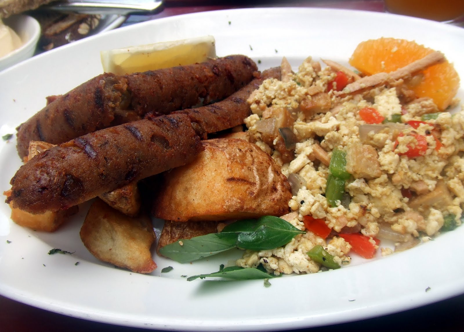 There are two parts to the entree portion of the menu: the “Rise and Shine” portion features lighter fare like pasta and salads and the “Power Brunch” section which offers heartier fare. No surprise, Tom and I ordered from the “Power Brunch” selections. I chose the breakfast scramble which was tofu, button mushrooms, red and yellow peppers and though the menu didn’t mention it, strips of vegan ham. It is served with a choice of vegan Italian sausage, bacon or ham, home-style potatoes and toasted seven-grain bread.