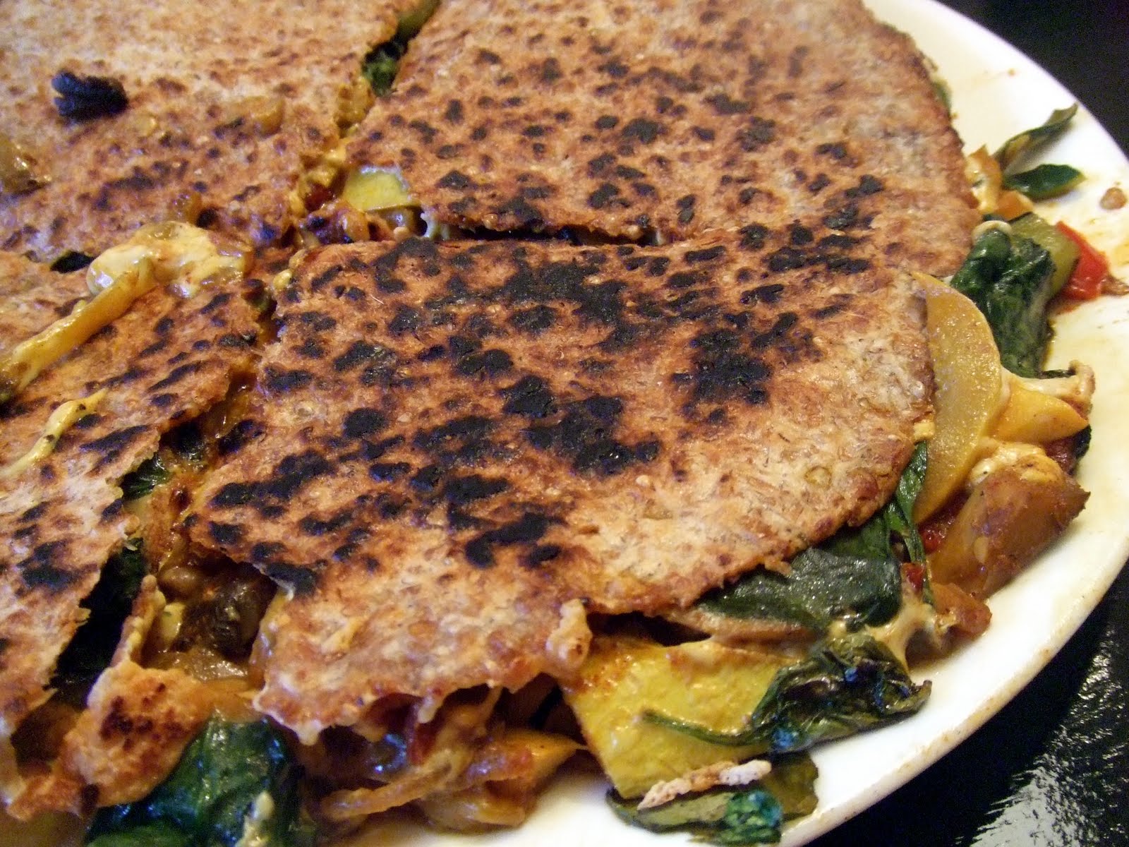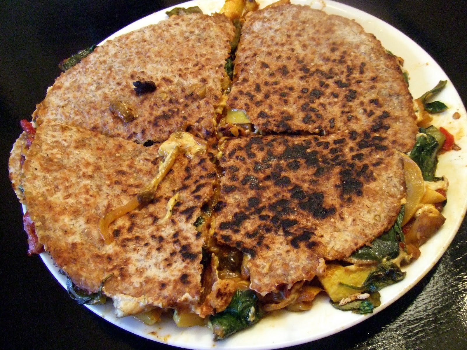A trip to the health store yielded two healthy finds: Joseph’s Flax, Oat Bran and Whole Wheat Flour Lavash Bread (who says quesadillas have to be round?) and Ezekiel 4:9 Sprouted Grain Tortillas.