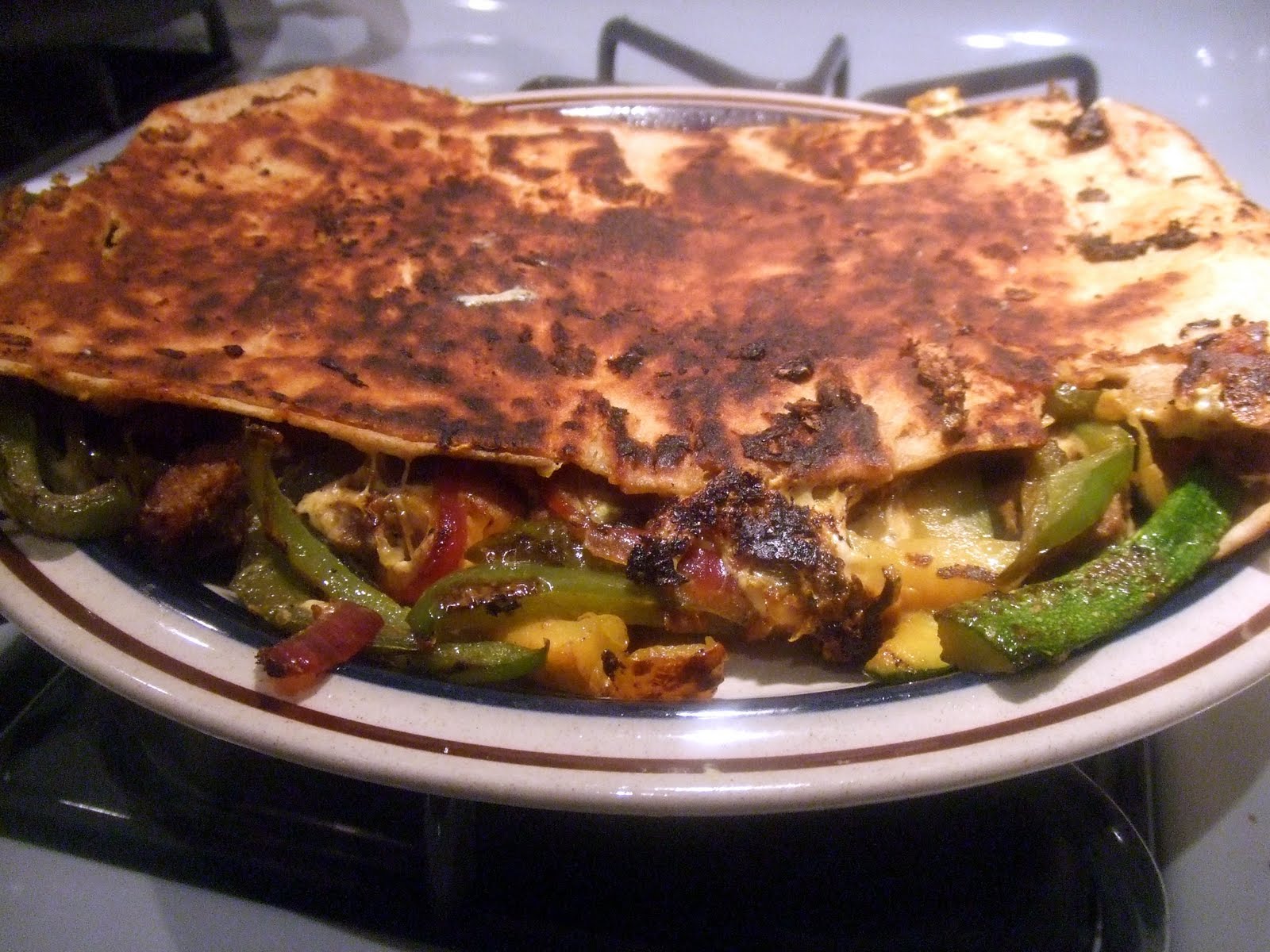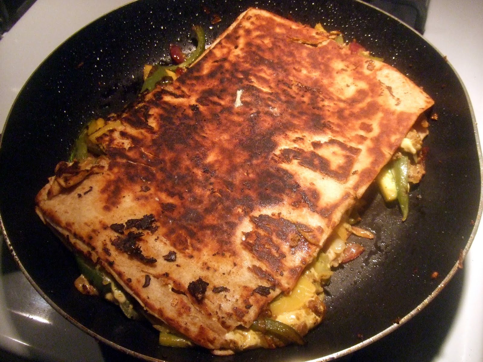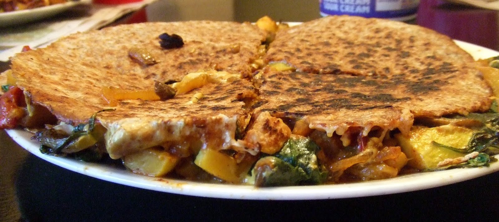 Meanwhile, heat a frying pan and spray with canola oil. Add a tortilla or wrap to the pan. Put a layer of baby spinach leaves and some Vegan cheese on the tortilla. Cover with a generous amount of the vegetable mixture. Add more cheese and spinach and top with another tortilla. Let cook a couple of minutes (not too long; you just want to brown the tortilla).