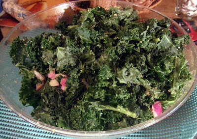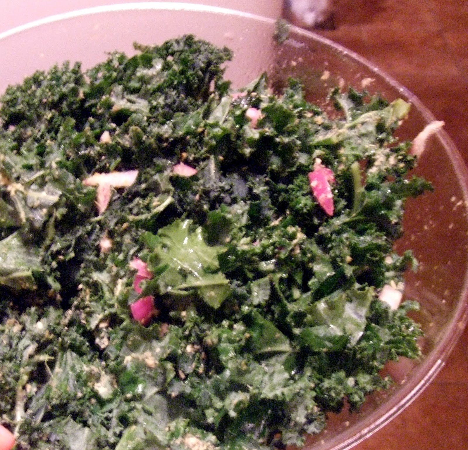 Put chopped kale into a large bowl. Add sliced onions. Add salt, pepper, garlic powder, and nutritional yeast. Add oil (or spray leaves) and toss well. Phew! That was tough.