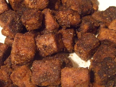 Mix all the marinade ingredients in a deep bowl. Cut the tofu into small cubes and immerse them in the marinade. Let sit for at least 15 minutes; the longer, the better but I find 15 minutes to be just fine. Mix all the breading ingredients into a shallow dish.