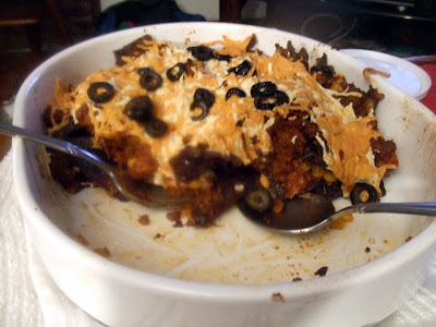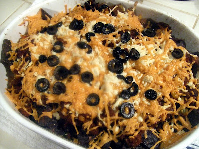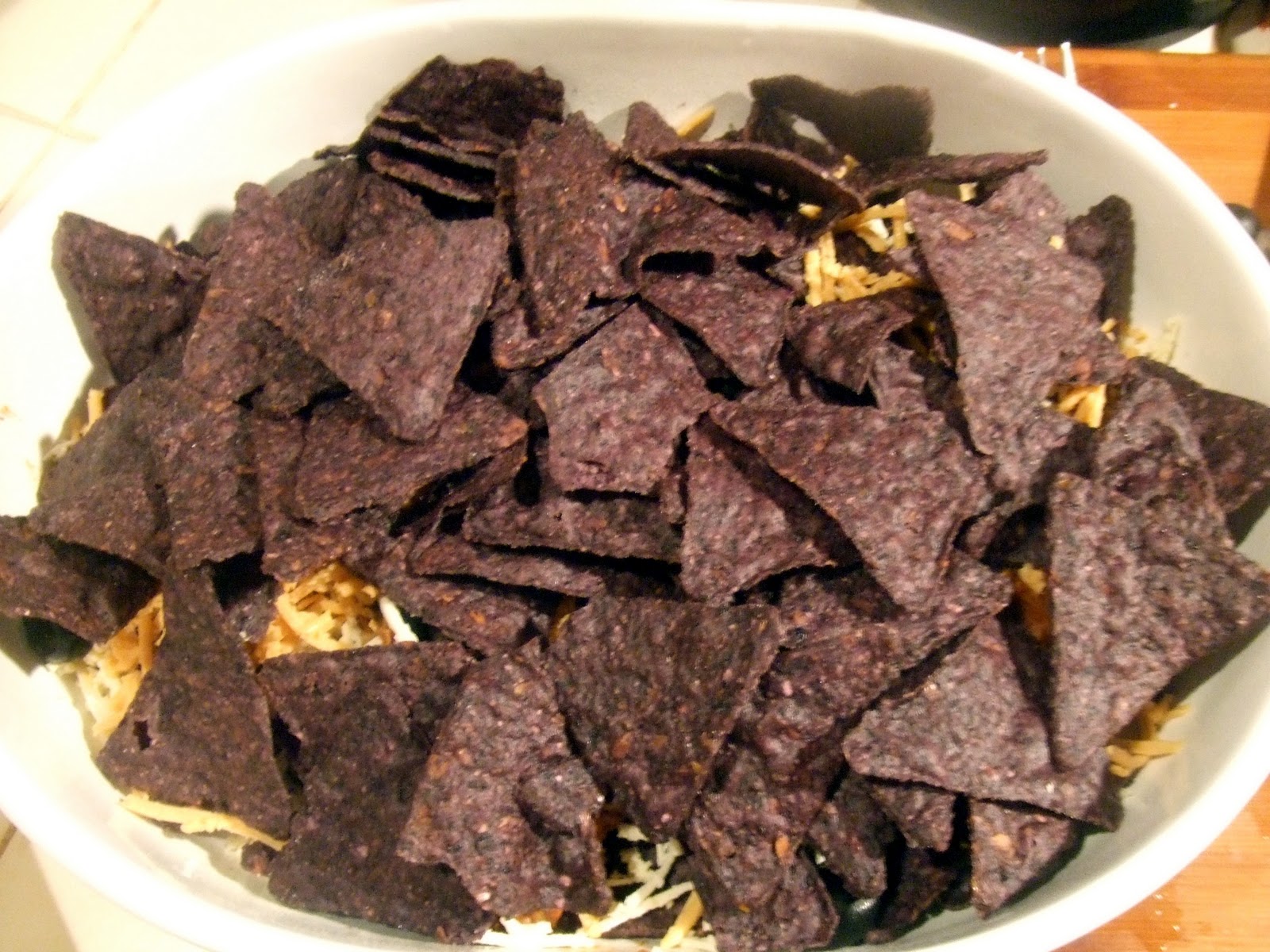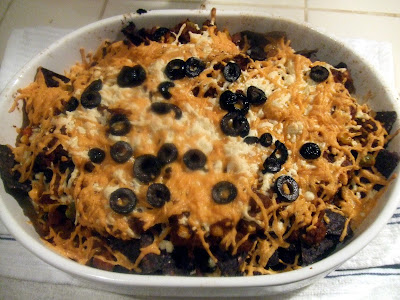 When the picadillo is ready, spray a casserole dish lightly with cooking spray. Layer the dish with tortilla chips. Then spoon half the picadillo onto the chips. On top of the picadillo, add half the Daiya and then half the black olives.