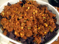 First I made my own Vegan version of picadillo using Gimme Lean “Beef,” onions, garlic, bell peppers, chipotle peppers in adobo sauce, corn and spices. Then I layered the chips, picadillo, black olives and Daiya cheese – both mozzarella and cheddar – into a casserole dish and baked it. Vegan sour cream and salsa on the side and we were in nacho heaven.