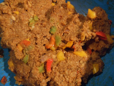In a large bowl, add the Gimme Lean (it’s easiest to handle if your hands are wet) and break it up a bit. Add the cooled onion, garlic, bell pepper and chipotle pepper to the bowl. Add the spices (no salt is necessary because there is salt in the chips, the cheese and the olives) and mix thoroughly with your hands.