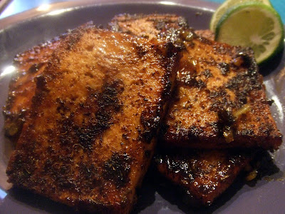 Press the slices of the tofu or tempeh into the spice blend and cover both sides with it.