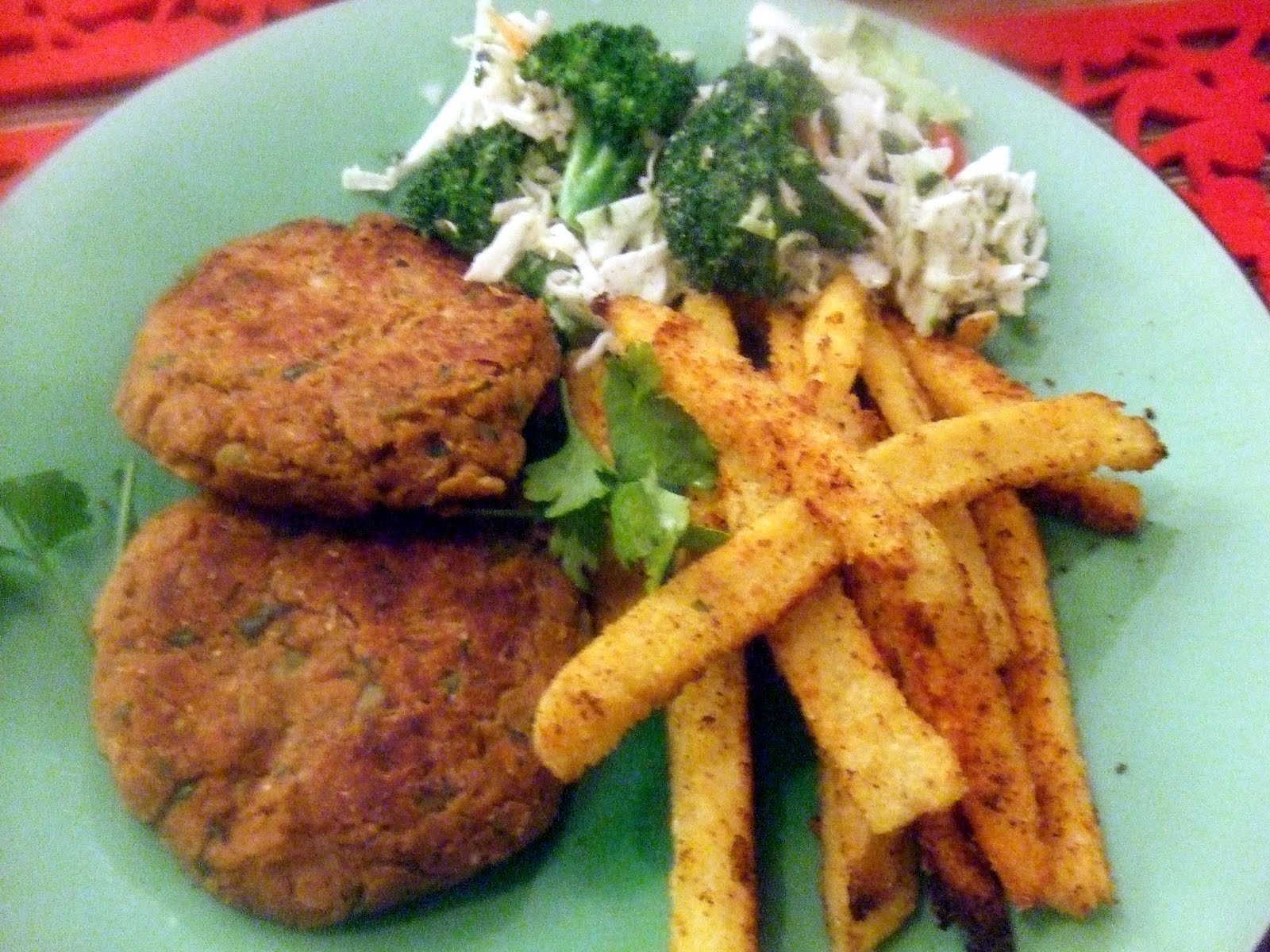 Add 1 Tbs. oil to a pan (I just wipe out the one I used to cook the veggies) and add the patties. Fry them in batches (or use 2 pans at once) over medium heat – you want to be sure the inside cooks too – about 7 minutes per side until they are golden and crispy. You could also bake them but it takes much longer.