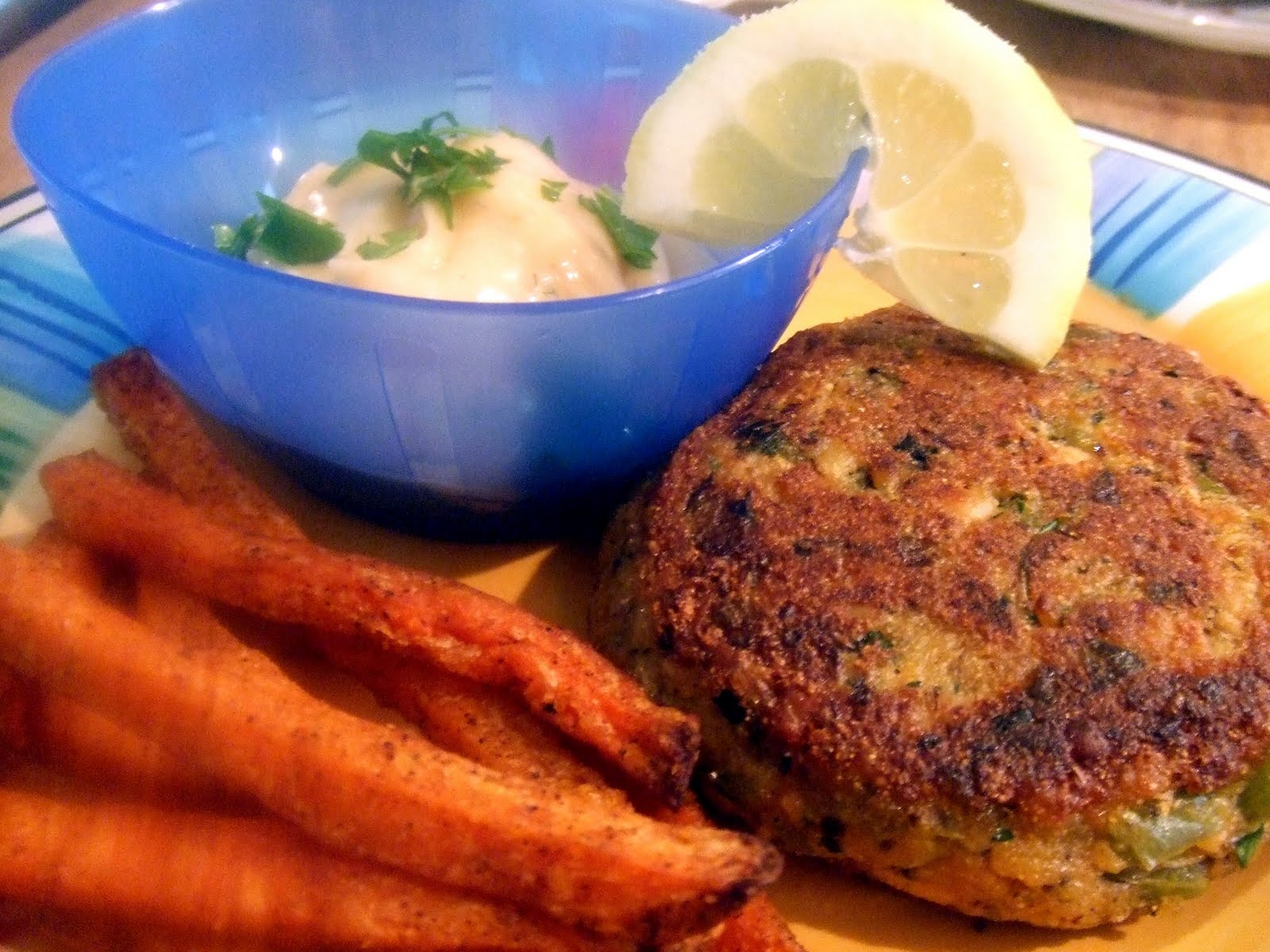 I served them with baked sweet potato fries and my Horseradish-Dill Mayo. It wan’t exactly easy to recreate a dish I only tasted once in my whole life but Tom was more than willing to assist…in making them as well as eating them. And by the end of dinner, Tom was a lot less crabby 🙂