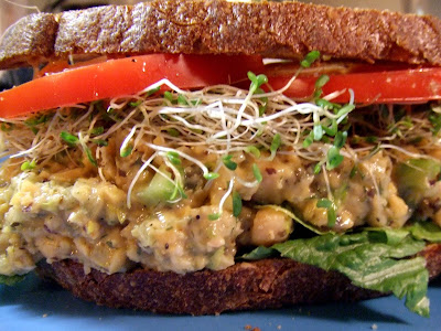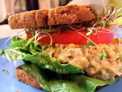 Serve the chickpea “tuna” salad on a platter with lettuce and veggies or put it in a sandwich. I added romaine lettuce, tomatoes, and alfalfa sprouts to mine. Tom had his on sourdough bread while I had mine on gluten-free red rice bread.