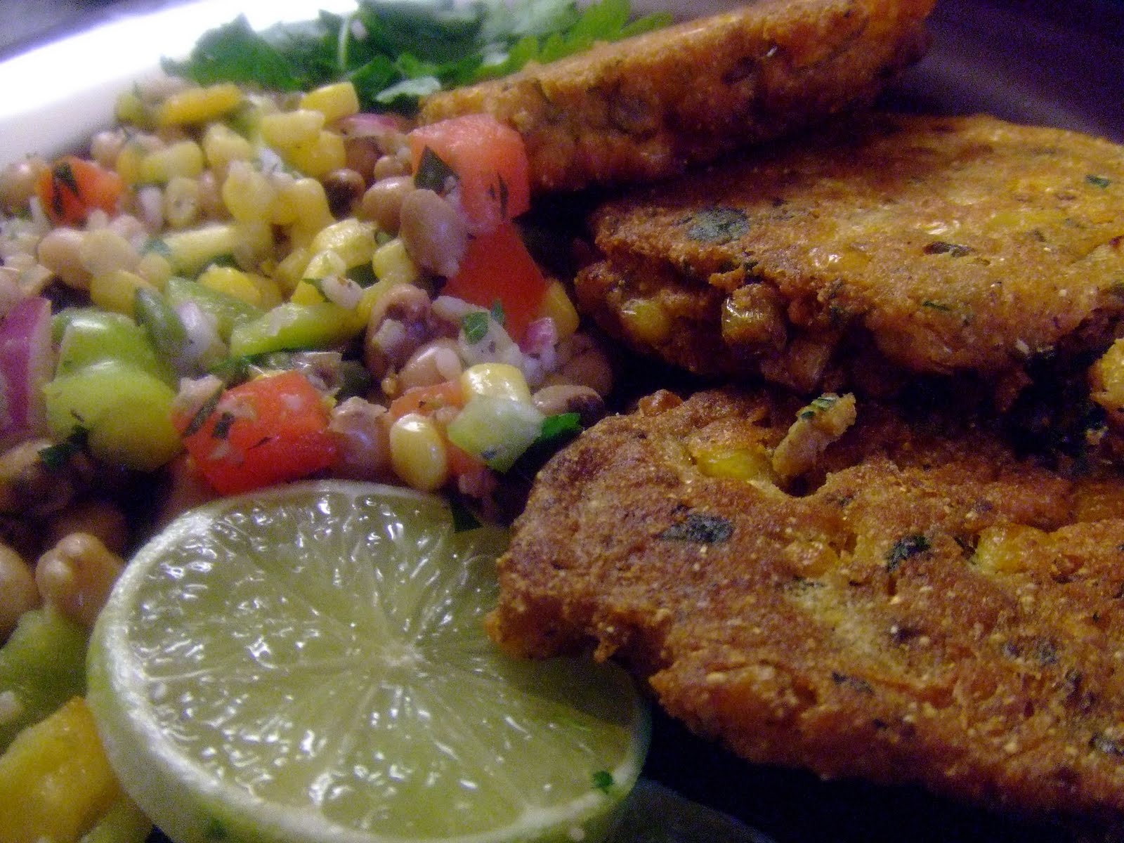 The salsa is a colorful mix of black-eyed peas, corn, tomatoes, green beans, red onion and bell peppers marinated in a tangy vinegar and lime dressing. The corn cakes are quick and easy to make. Crispy and satisfying, they are delicious served hot or cold, covered with the beautiful salsa.