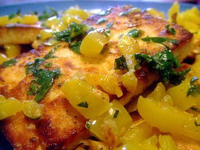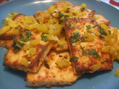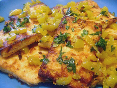 Remove the tofu from the skillet and set aside on a warm plate. Lower the heat to medium low and add the banana peppers to the skillet. Add the pepper juice from the jar along with the vegetable broth (add less broth if you want less sauce, more if you want more sauce). Melt the butter into the sauce.
