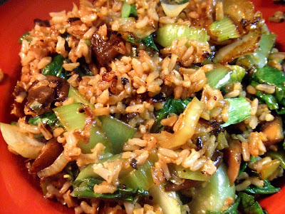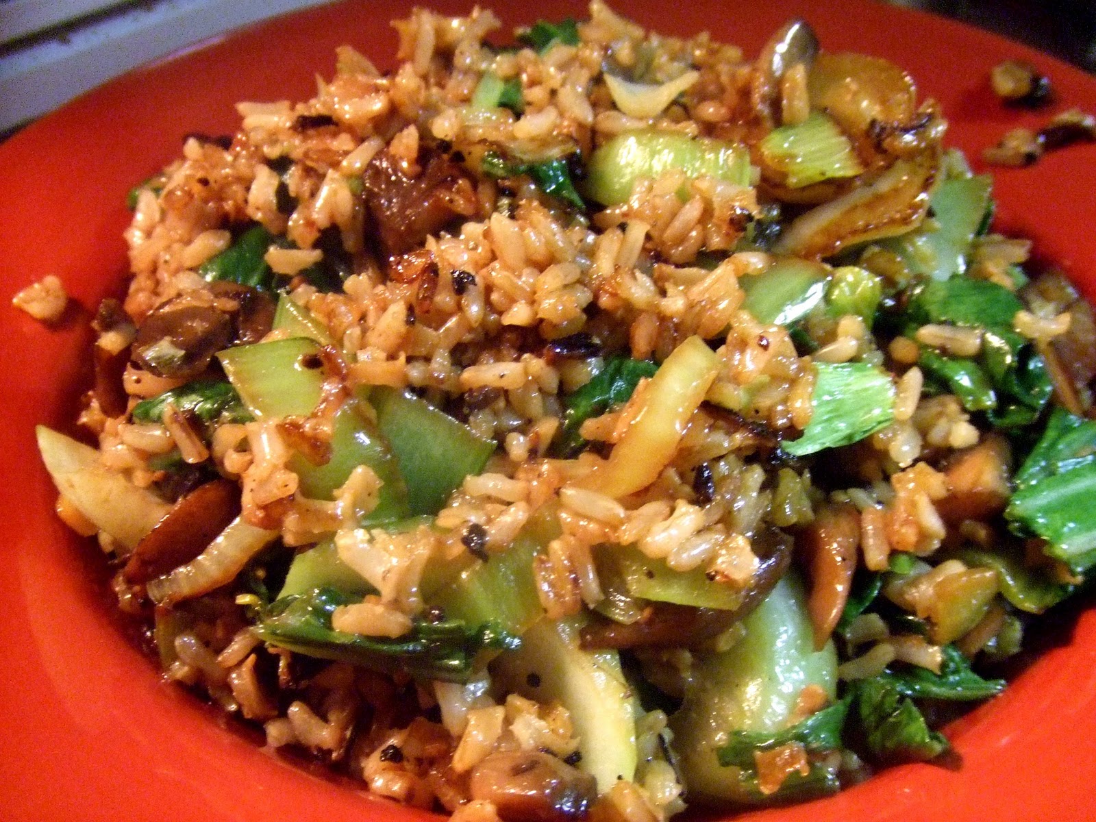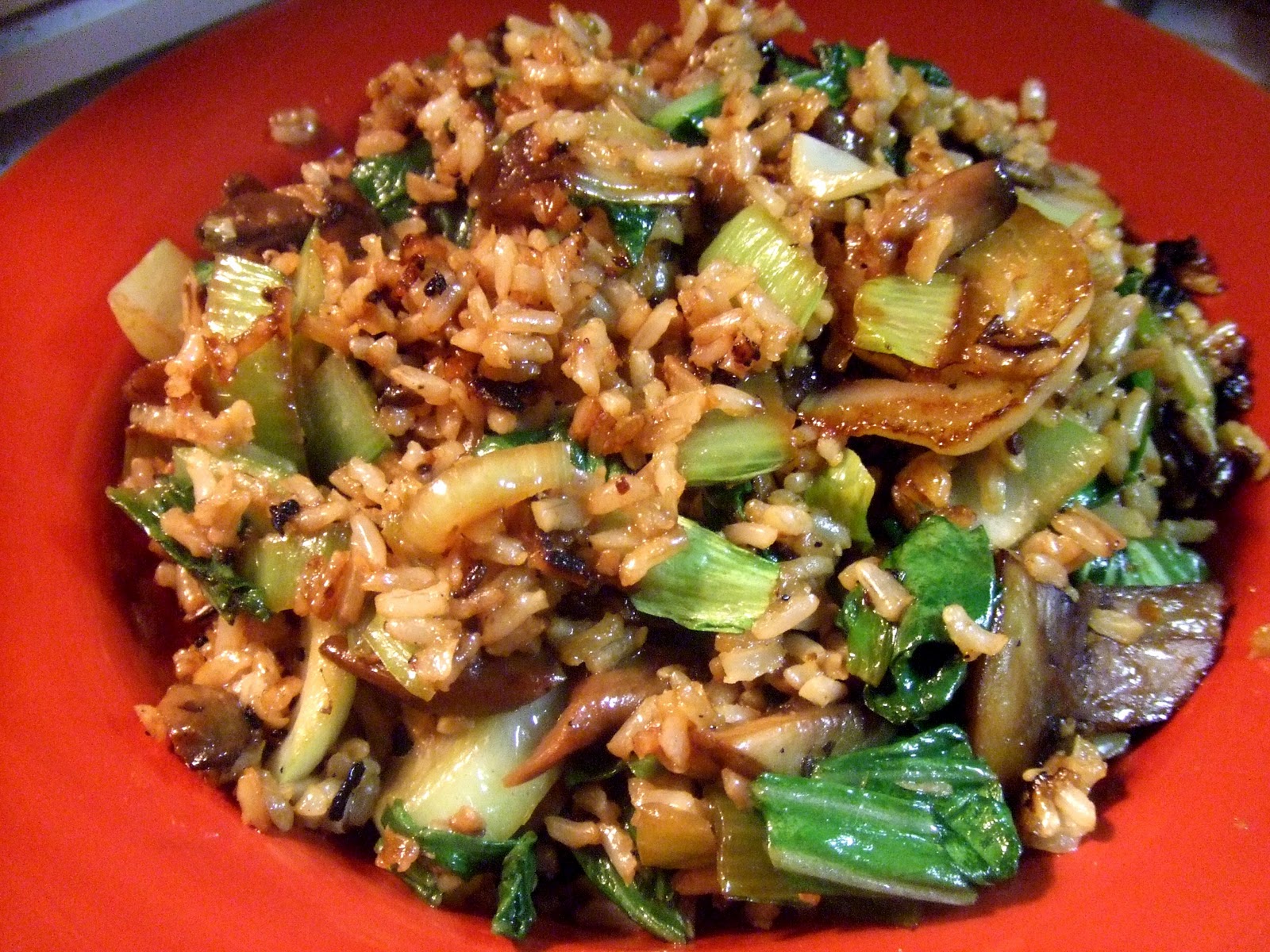 Crispy fried rice, crunchy bok choy and creamy mushrooms come together with fragrant and flavorful garlic, ginger and chile pepper to make an easy, comforting meal that is ready to eat long before the take-out would be delivered. For extra fun, serve it in take-out containers with chop sticks and maybe, fortune cookies that say “Go Vegan”…in bed 🙂