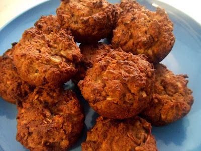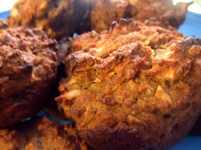 Mix the dry ingredients (first 7 ingredients) in a large bowl. In another bowl, mix the flaxseed/water, oil, apple sauce, sugar, and vanilla. Add the apples to the wet mix and stir them in well.