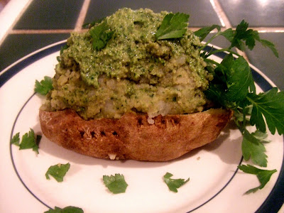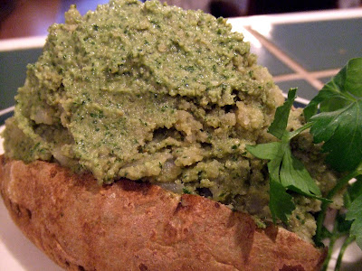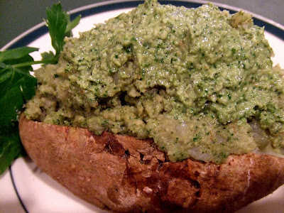 The “V” Word continues the VeganMoFo month of food with the letter “D”. Today the letter “D” is for Double-Stuffed Pesto Baked Potatoes.