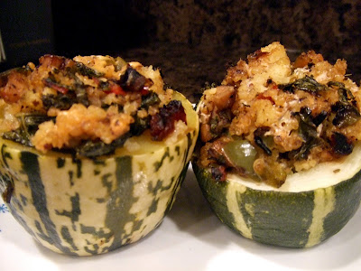 Put the squash halves into an oiled baking dish. Fill each squash with the stuffing. Pack it in and fill them generously. Cover the baking dish tightly with foil. Bake for about 1 hour until the squash is tender.