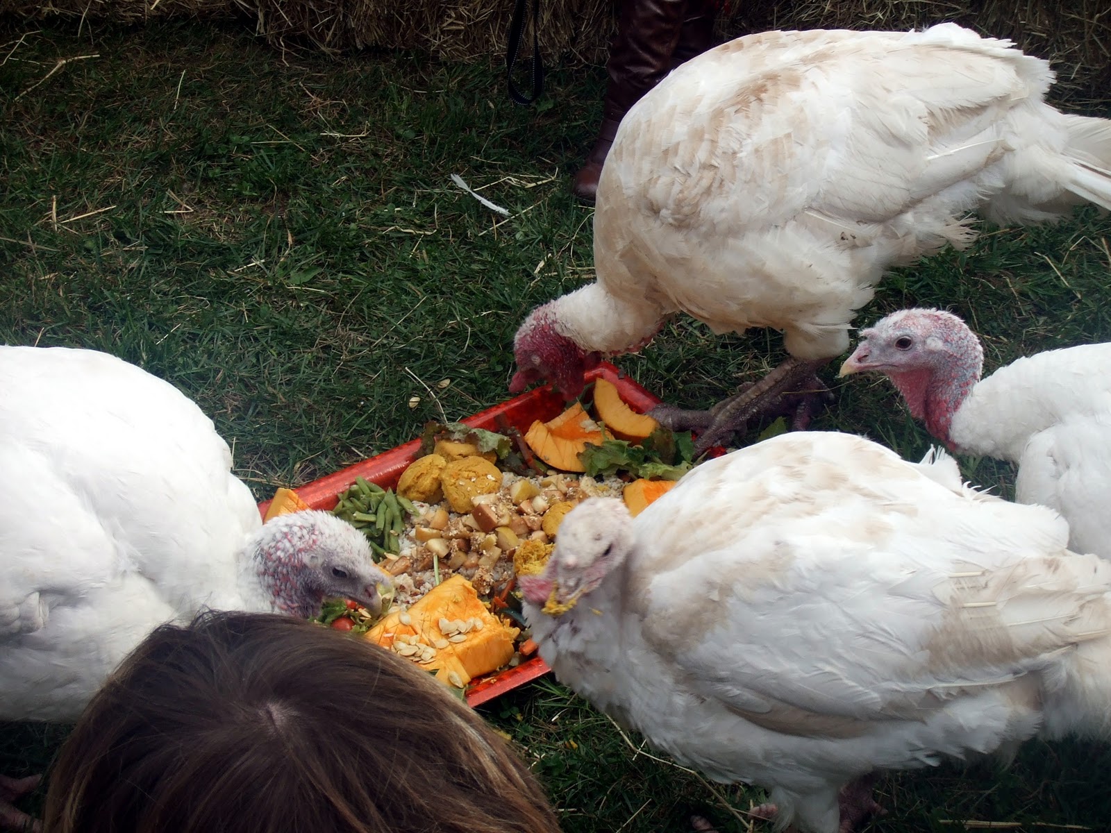 Then we went to watch the main event: the turkeys were fed their ThanksLiving dinner. What a feast. Butternut squash, cornbread and other goodies were laid out on a festive platter. Beatrice, Petunia, Boone and Alphonso dug into their celebratory dinner. And these beautiful birds certainly have a lot to celebrate.