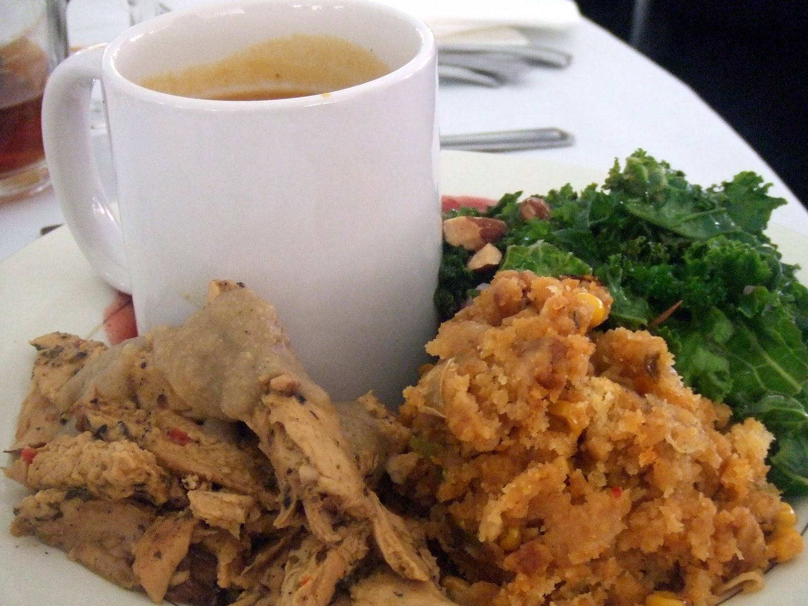 We had Chipotle Sweet Potato Bisque with Cashew Crema, Savage River Faux Chicken Rojas in Orange Garlic Mojo, Cornbread Sofrito Stuffing with Veggie Chorizo and Massaged Kale Salad with Raisins and Toasted Almonds. It was the most amazing meal I’ve ever had. Every single thing was delicious. I could have easily eaten a second plate. In fact, a woman at our table had 2 little kids who weren’t eating their food and she probably saw me eyeing it because she quickly packed it away 🙂