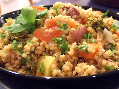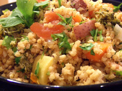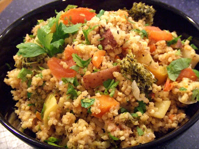 When made traditionally, Upma should have the consistency of porridge – sort of an Indian polenta. However, I prefer mine drier with a consistency that is more like rice. This is one of those recipes that is great for cleaning out the fridge. I used whatever vegetables I happened to have – tomatoes, potatoes, yellow squash, carrots and broccoli. You can use whatever vegetables make you happy. Dry roasting the millet before cooking with it brings out an even nuttier flavor.