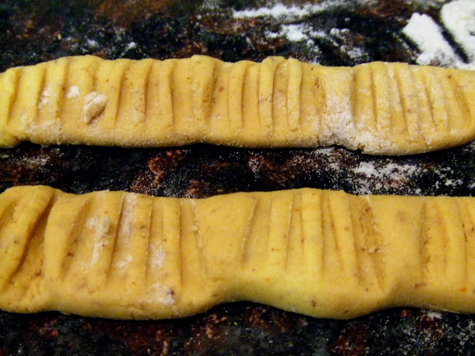 Dust some flour on a flat surface. Divide the dough into sections and roll the sections into balls. Then roll each ball into a long tube, about ¾’ in diameter. Press the tines of a fork into the tube to form indentations in the dough.