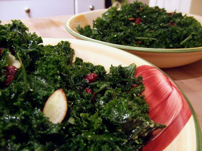 Place the kale in a large bowl. Rub some olive oil on your hands and massage the kale for a few minutes until it is softened and bright green. Add the pesto to the bowl and massage it into the kale as well until it is throughly distributed. Add salt and pepper to taste. Sprinkle the salad with dried cranberries and slivered almonds.