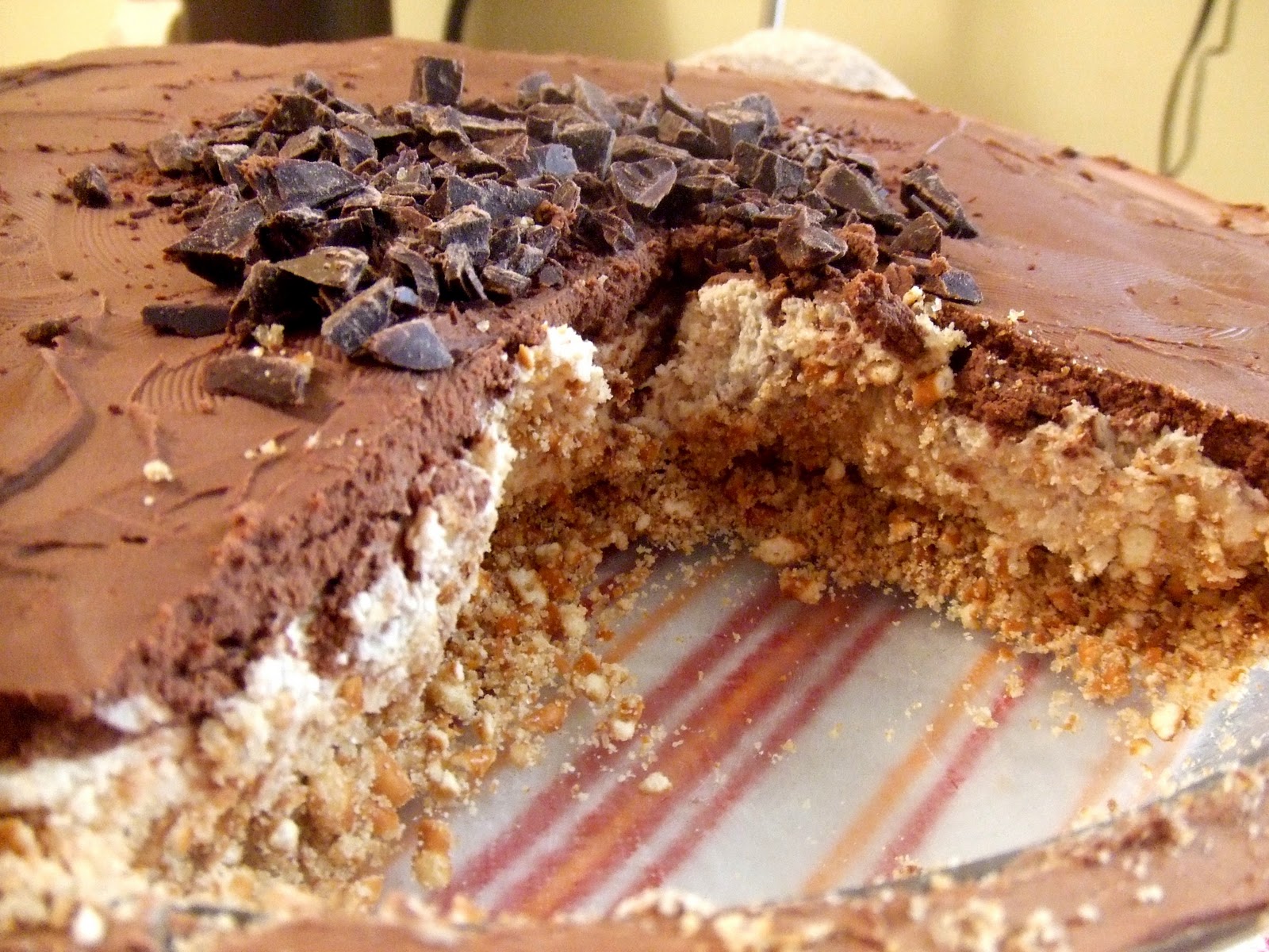 When the pie and filling have chilled, cover the pie with the chocolate whipped cream. Garnish with chocolate shavings, pretzels or your favorite topping. You can refrigerate the pie longer to let it set more or you can serve it right away. Enjoy!