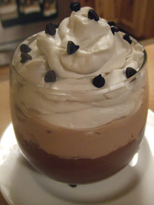 To make the chocolate mousse, simply melt the chocolate chips in a double boiler (a metal pot or bowl sitting atop a pot of water over medium heat). Stir the chips until they are just melted and silky. Let the melted chocolate cool a bit and then add it to the whipped cream. Fold it in gently so the whipped cream stays light. Spoon the mixture into serving glasses and refrigerate for at least an hour or until it sets up. Top with whipped cream, chocolate chips or your other favorite toppings. Enjoy!