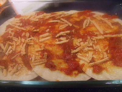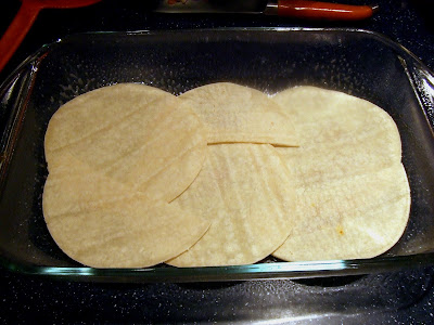Layer the tortillas to cover the bottom of the casserole dish. You may need to cut some tortillas in half to make sure the whole dish is covered.
