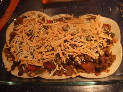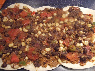 Spoon half the picadillo onto the tortillas and spread evenly with a spatula. Top with half the bean/corn mixture and ½ cup of Pepperjack shreds.
