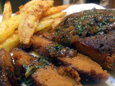 Serve the seitan steak on a plate. Drizzle on the beurre blanc sauce and serve with the Oven-Baked Fries. Enjoy!