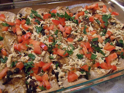 Bake for 25 minutes until the tortillas are browned and the cheese, if using, is melted. Remove from the oven and top the enchiladas with chopped tomatoes and cilantro.