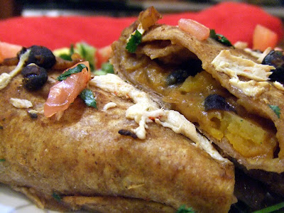 Preheat the oven to 375 degrees. Spray a 9 x 13 casserole dish with cooking spray. Spoon some of the remaining bean sauce into the dish. Take a tortilla and place about 3 Tbs. of the black bean-squash mixture in the middle. Roll the tortilla up and place seam side down in the casserole dish. Repeat with the other 5 tortillas. Pack them tightly into the dish. Pour the remaining bean sauce on top of the rolled tortillas. Sprinkle with vegan cheese shreds, if desired.