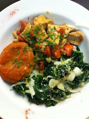 Cornmeal Crusted Tofu with Black Olive Roasted Pepper Fennel Relish, Quinoa and Spring Vegetables with Caramelized Oyster Mushrooms and Garlic Scallion Sauce, Sauteed Kale and Rosemary White Bean Sauté