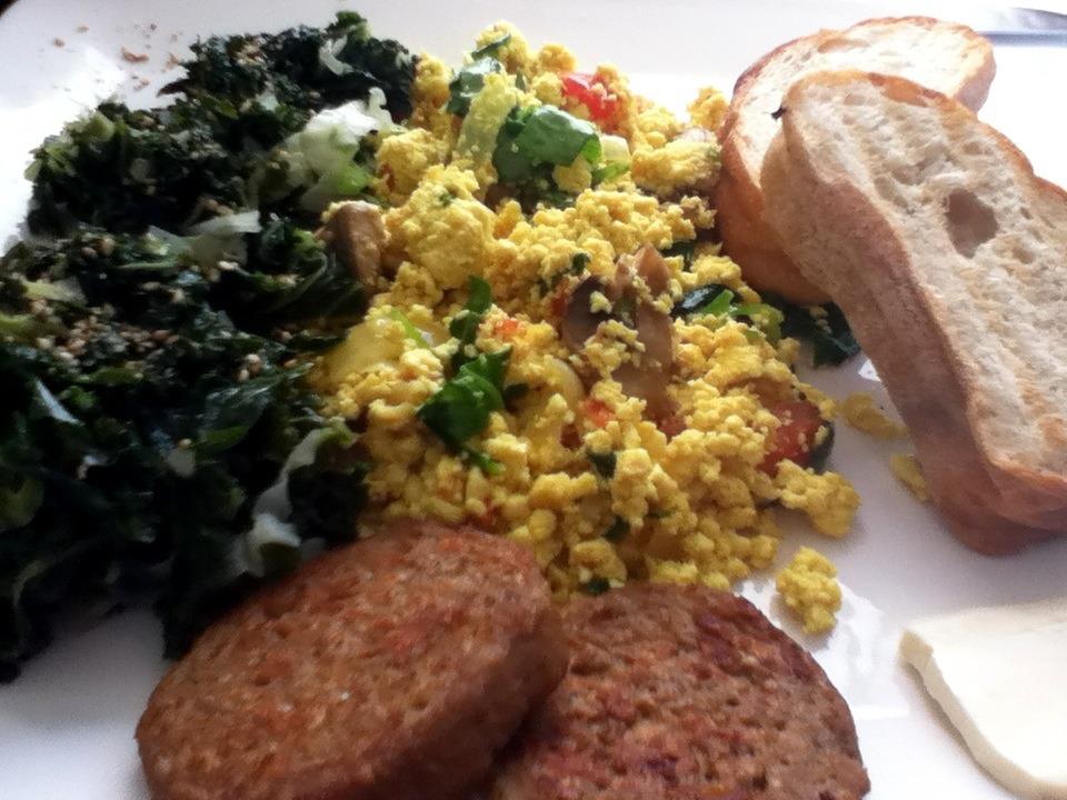 And nothing makes the weekend more special than a scruptious vegan brunch. My usual is the Italian Tofu Scramble with a side of sauteed greens and vegan sausage.