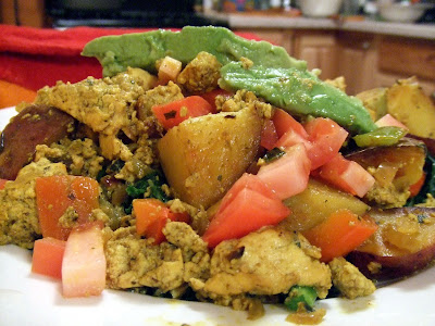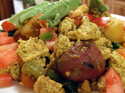 Heat the oil in a large sauté pan on medium high. Transfer the parboiled potatoes into the sauté pan and cook until browned, turning them halfway through. When the potatoes are browned, add the scallions, onions, and peppers to the pan and cook, stirring, until softened and tender, about 5 minutes. Crumble the tofu into the pan and let it cook until slightly browned, about 5 minutes.
