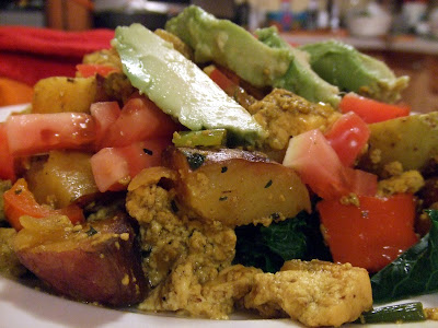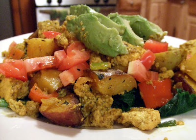 It’s all the best parts of breakfast (or dinner) in a one pot dish: crispy potatoes, moist tofu, Southwestern spices and the fresh tastes of tomatoes and avocados all served over healthy, bright greens. This has become my new favorite go-to tofu scramble. Try it. I know you’ll love it. And even more importantly, I know you will love the feeling of knowing you are not contributing to the torture and death of beautiful chickens and their babies. Compassion is the best ingredient!