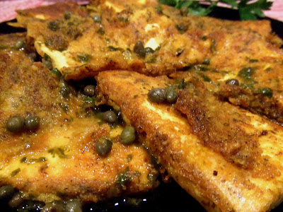 So I decided to recreate another of my old favorite dishes in a healthier, more compassionate way. The tofu (not chicken) is battered without eggs but it looks and almost tastes like it is. The sauce is a bright combination of lemon and white wine. It tastes delicious served over linguine or rice. (If you choose to make it without pasta or rice, cut the amount of white wine and broth in half to make less sauce).