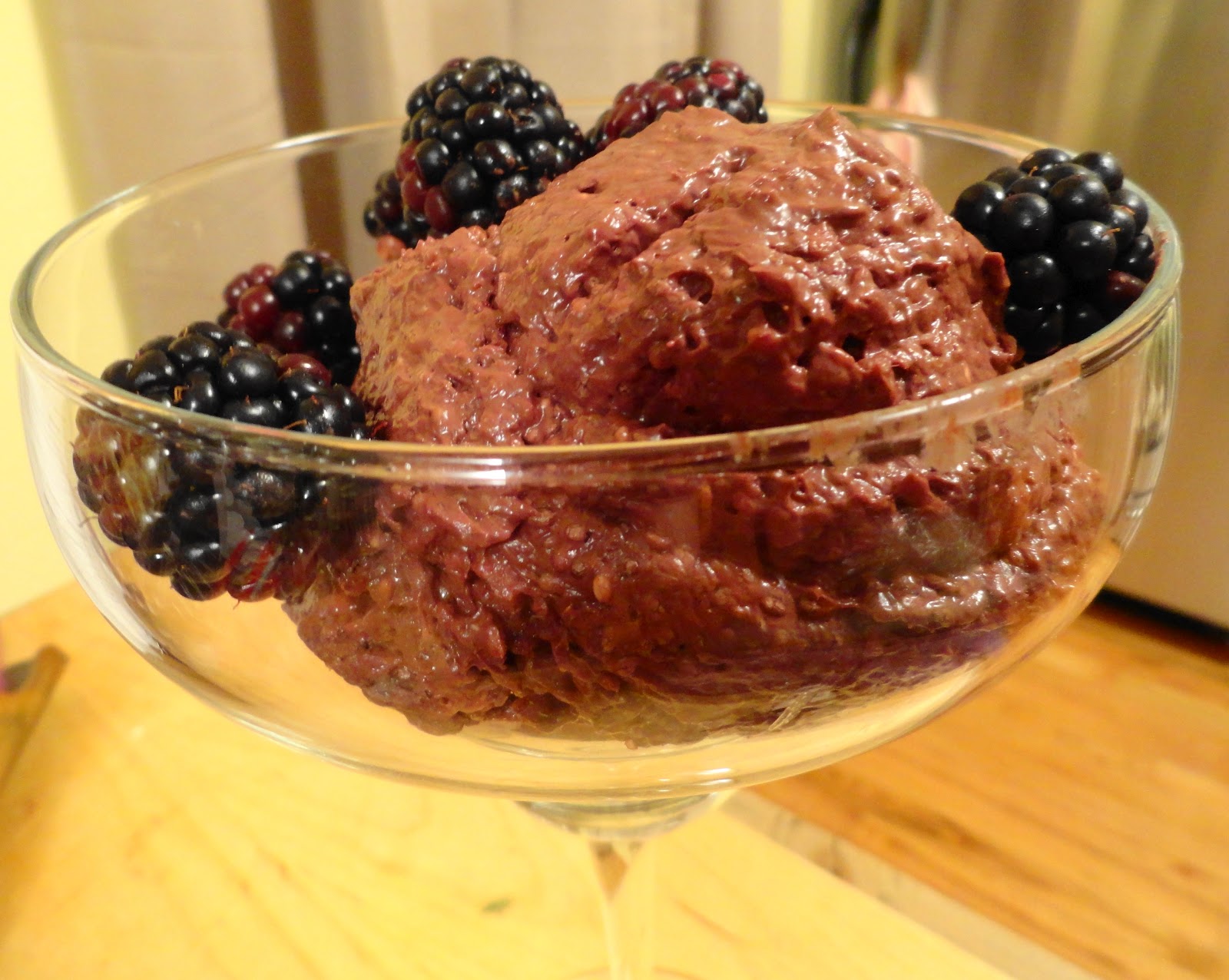 Instead of sugar, I used fresh dates in the pudding. I used 4 but I don’t like sweets so if you like things sweet, use more. The blackberries we got were pretty tart but Tom said he liked it that way and not to add more sugar. Again, that would be up to your individual taste. Any fruit could be used; we just happened to have blackberries. The pinch of salt is essential to bring out the flavor of the chocolate.