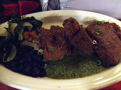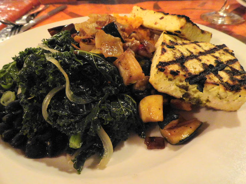 You would think we couldn’t eat another bite after all the appetizers but I have my journalistic obligations 🙂 The first time we went to NWHC, Tom had the Blue Corn Crusted Seitan. It comes with tomatillo salsa, black beans, brown rice, island yams and greens. Tom loved the seitan which was HUGE! I couldn’t keep my fork out of his plate because the rice, beans and greens reminded me of the Ital food I miss so badly.