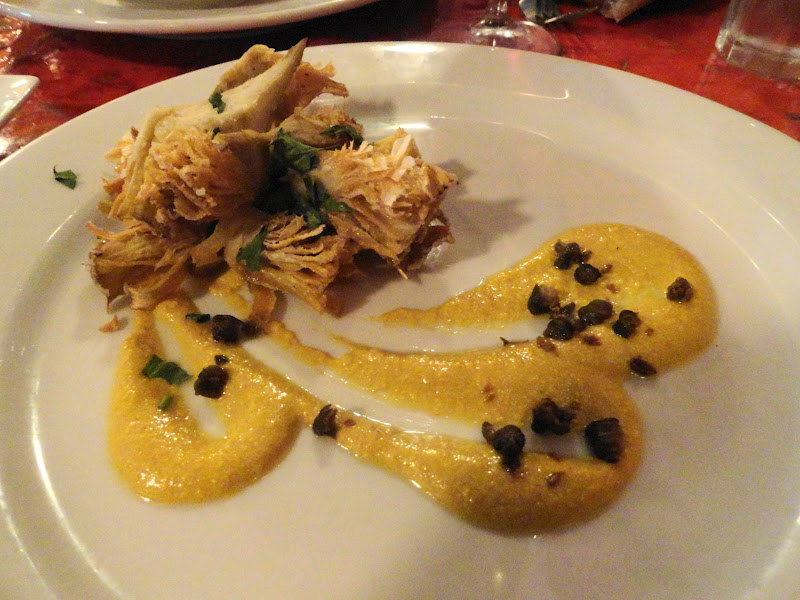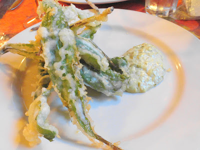 There are small plates: Sweet Chile Tofu and Watermelon Salad, Moroccan Carrot Hummus, Mushroom “Ceviche”, Warm Garlic-Chile Olives and a Veggie Tapas Plate. You should always check the specials: we had the most incredible Ramps Tempura.