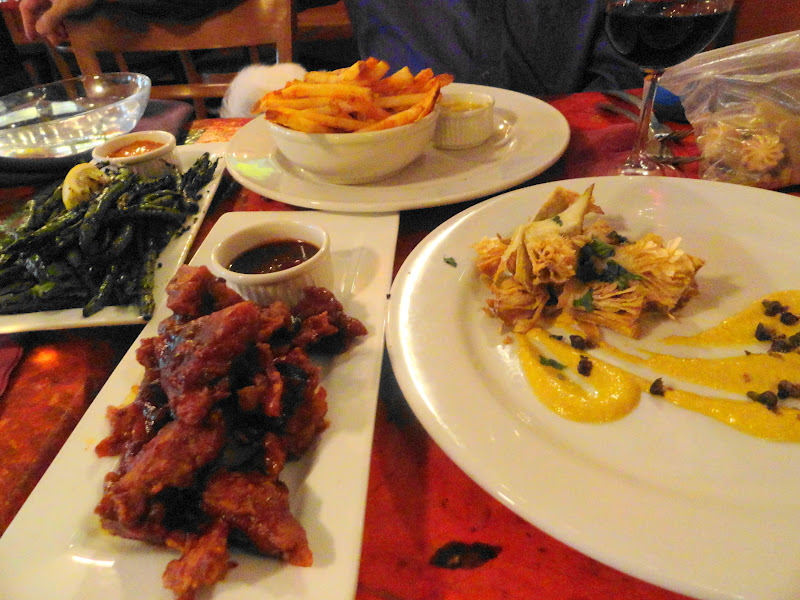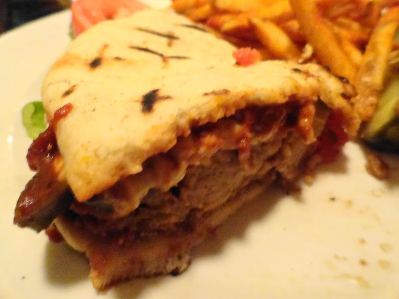 The third time we went with our friends, Jenny and Doug. After sharing a bunch of appetizers, Tom had the Seitan “Parm” and I tried the Meanhouse BBQ Seitan Burger which was served on grilled flatbread with jalapeno and Daiya.