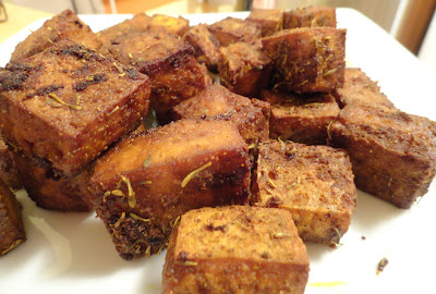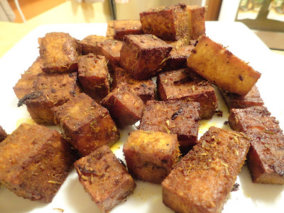Cut into slices, you can use the same preparation of tofu and then top it with different sauces: maybe sauteed mushrooms, perhaps an apricot glaze or how about a tangy BBQ sauce. Once you have the foundation of flavorful baked tofu, you have an almost blank canvas to create other masterpieces with. Cut into cubes, they can be an entree on their own or you can throw them into chili or soup. My favorite thing to do with cubes is throw them in a salad in place of croutons.
