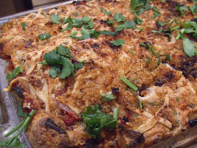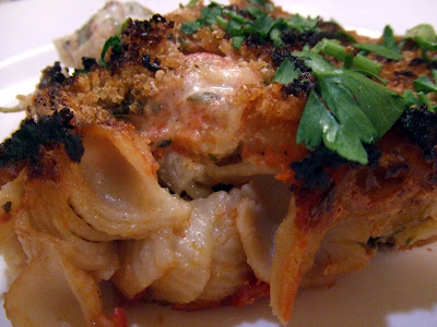 Cover the dish with foil and bake for about 20 minutes until the cheese is melting and the sauce is bubbling. Uncover the dish and cook for another 5 to 10 minutes until the bread crumbs are browned. Remove from the oven and let sit for 15 minutes or so. This helps the pasta to set.