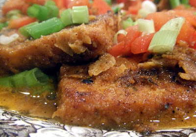 Preheat the oven to 200 degrees. Heat the oil in a large pan over medium-high heat. You can tell if the oil is ready by throwing a pinch of flour into the pan. If it starts sizzling, the oil is ready. Saute the tofu slices until they are browned, about 4 minutes on each side. If your pan is not big enough for all 8 slices, cook the tofu in batches. Transfer the tofu cutlets to a warm platter and put it in the oven. This will keep the tofu crisp.