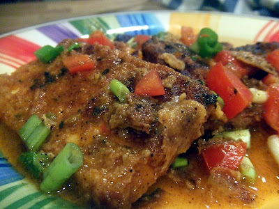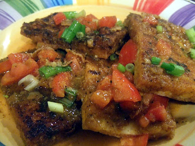 Add the fresh tomato and non-dairy creamer into the pan. Mix well. Throw in some chopped basil leaves and stir. Add salt and pepper to taste. Cook until just heated through. You don’t want the tomatoes to dissolve. The sauce should be chunky. Remove the tofu cutlets from the oven and pour the sauce over the tofu cutlets for a beautiful and delicious topping. Garnish with scallions and serve while hot. Enjoy!