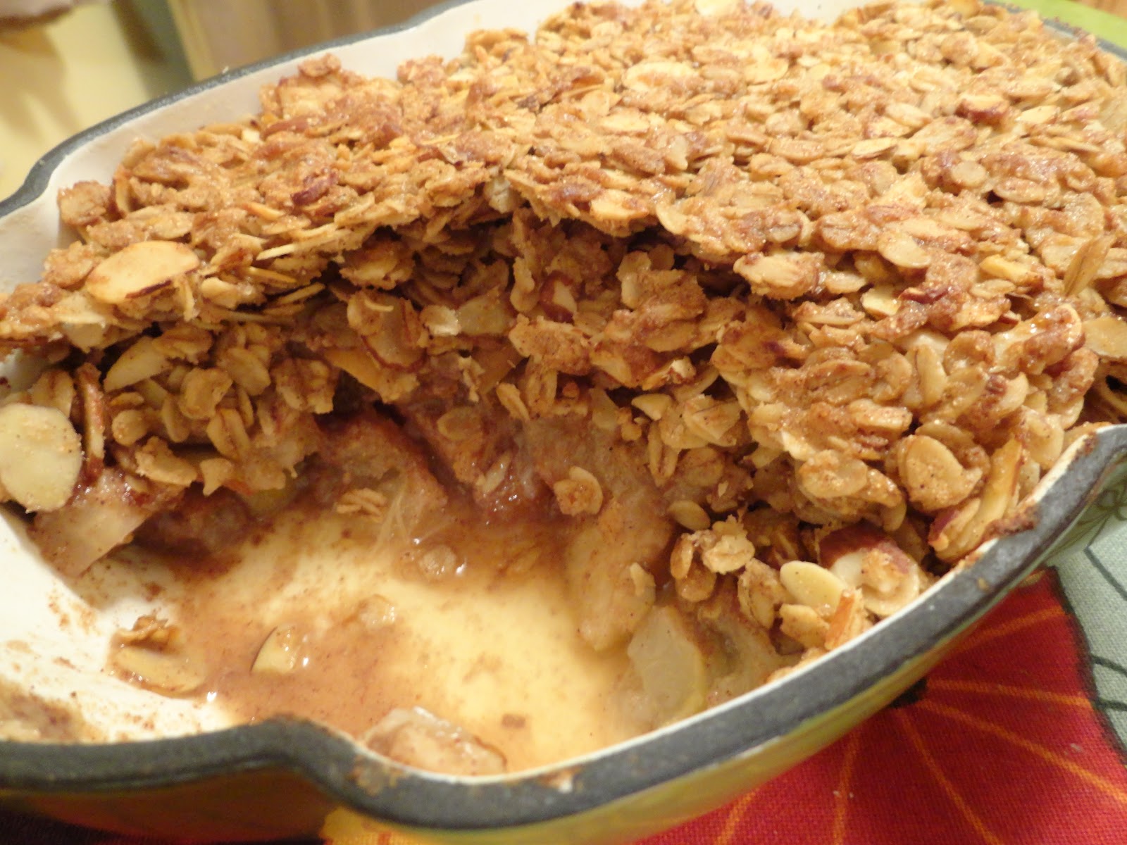 In the end, though, I chose a dessert. Gina has a recipe for a Pear and Apple Cobbler and while, amazingly, there is no pork in the recipe, it’s not very healthy. It involves over a cup of sugar, 6 Tbs. of butter and an egg. My Apple & Pear Cobbler uses no sugar, just 2 Tbs. of maple syrup, only 2 Tbs. of vegan butter and no eggs. Instead of a dough for the topping, I use a combination of oatmeal and almonds.