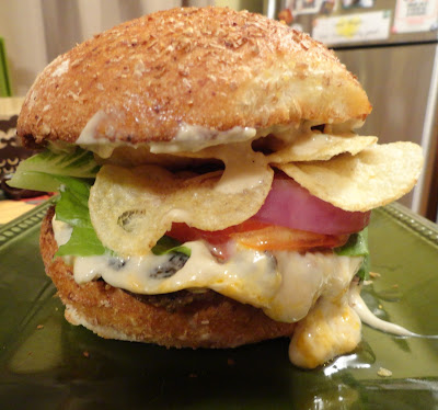 Place the burgers on the bun bottoms and, if desired, top with tomato, lettuce, onion, and a dollop of horseradish mustard mayonnaise. Pile on the potato chips, top with the bun tops, and serve immediately. Make sure you have tons of napkins because it’s going to be messy.