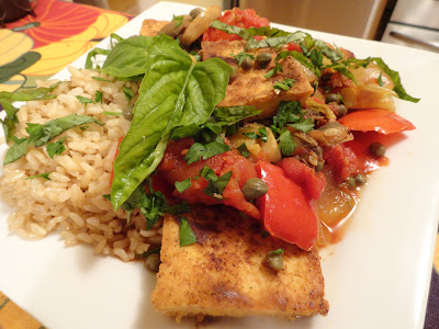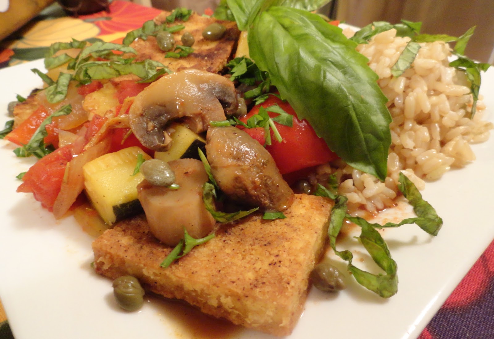 Remove the tofu from the oven and transfer to a serving platter or individual bowls. Spoon the cacciatore sauce and vegetables over the tofu. Garnish with fresh basil or parsley. Serve over brown rice or pasta.