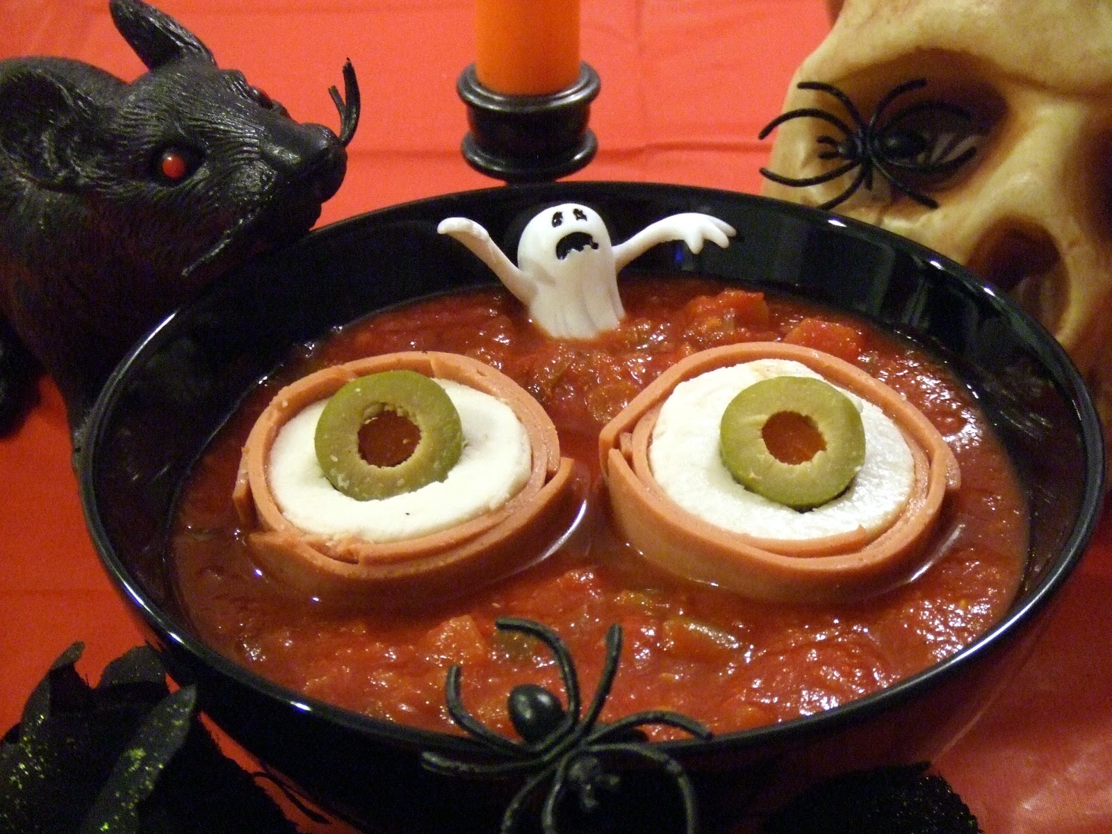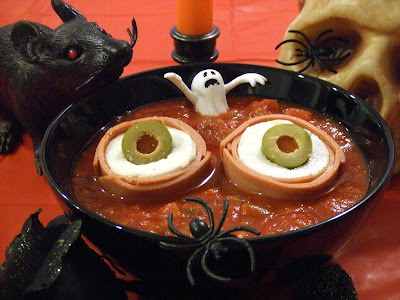 Fill bowls with the salsa and carefully place your eyeballs…well, 2 of the eyeballs you made…into each bowl. Alternatively, you can fill a large bowl with salsa and lots of eyeballs to stare at your guests. Lookin’ good, huh?